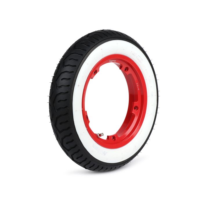 Roue complète (pneu monté sur jante) Mitas MC12 flanc blanc, tubeless, Vespa Smallframe V50, PV, ET3, PK 3.00 Jante 10 pouces TL 42J BGM Pro 2.10-10 aluminium rouge
