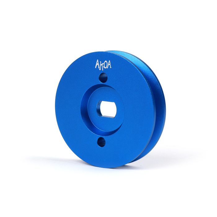 Poulie en aluminium fraisée CNC avec Ø 65mm de Akoa, adaptée à tous les cyclomoteurs Piaggio avec mono-boîte de vitesses, tels que Piaggio Ciao, Si, Bravo, Boxer, Grillo, Eco, Gilera CBA, etc. Beaucoup trouvent la poulie de 55 trop petite, mais celle de 65 déjà trop grande, c'est pourquoi nous avons fait fabriquer des tailles intermédiaires. Une assise absolument sans jeu sur l'arbre de transmission et une rotation parfaite. Plus d'ovulation du galet, plus de rupture de la demi-poulie soudée par points comme à l'usine. Disponible dans les tailles suivantes : 55, 60, 65, 70, 75, 80, 85, 90, 94 Les pull-overs CNC ont été anodisés en bleu et pourvus du logo Akoa en blanc.