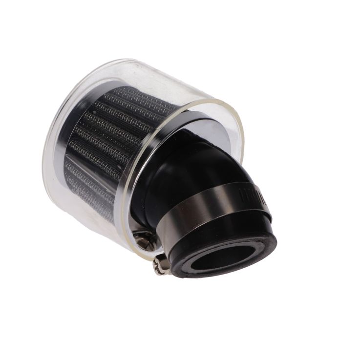 Raccord Powerfilter 28/35 mm coque en PVC transparent. Ce filtre à air est livré avec un caoutchouc coudé supplémentaire, de sorte que ce filtre à air peut être utilisé droit/coudé pour les connexions de carburateur de 28 et 35 mm. Grâce au caoutchouc coudé, ce filtre peut être facilement appliqué sur le carburateur Dellorto PHVA, entre autres choses.
